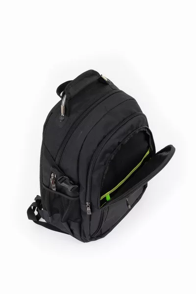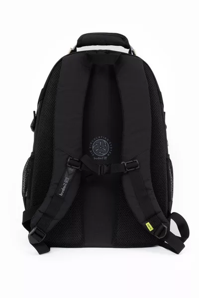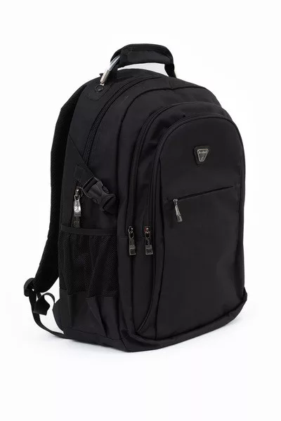 33x49x21 cm, 1,06 kg. Alapanyaga vízlepergeto. Mindkét oldalán hálós kulacstartó zseb. Légcsatornás hátlap. Három különálló cipzáros rekesz. Az elso rekeszben rendszerezo zsebek. Fémmel megerosített kézifogó. Laptoptartó: 26 X 38cm.