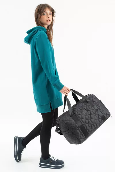 41X26X21 cm. Női sporttáska, utazótáska. Belül cipzáros zsebek. Elkülönített cipőtartó rekesz. állítható, leszedhető vállpánt. Gumicímkével díszítve.