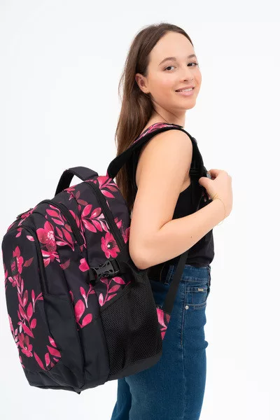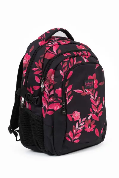 33x46x21cm, 0,87 kg. Alapanyaga vízlepergető. Mindkét oldalán hálós kulacstartó zseb. Légcsatornás hátlap. Három különálló cipzáros rekesz. Az első rekeszben rendszerező zsebek. Laptoptartó: 30X40cm.