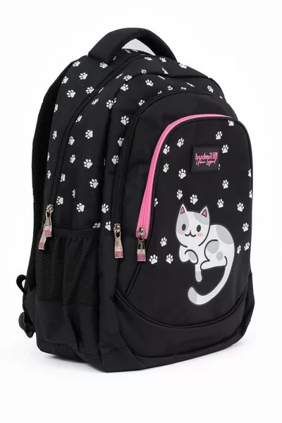 31x45x15 cm, 0,85 kg. Alapanyaga vízlepergető. Mindkét oldalán hálós kulacstartó zseb. Légcsatornás hátlap. Három különálló cipzáros rekesz.