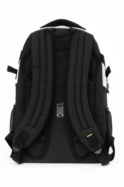 32x47x16 cm, 0,96 kg. Alapanyaga vízlepergető. Mindkét oldalán hálós kulacstartó zseb. Légcsatornás hátlap. Három különálló cipzáros rekesz. Az első rekeszben rendszerező zsebek. Laptoptartó: 26 X 38 cm.