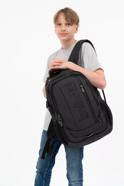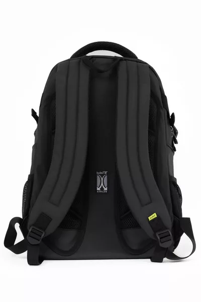 32x47x16 cm, 0,96 kg. Alapanyaga vízlepergető. Mindkét oldalán hálós kulacstartó zseb. Légcsatornás hátlap. Három különálló cipzáros rekesz. Az első rekeszben rendszerező zsebek. Laptoptartó: 26 X 38 cm.
